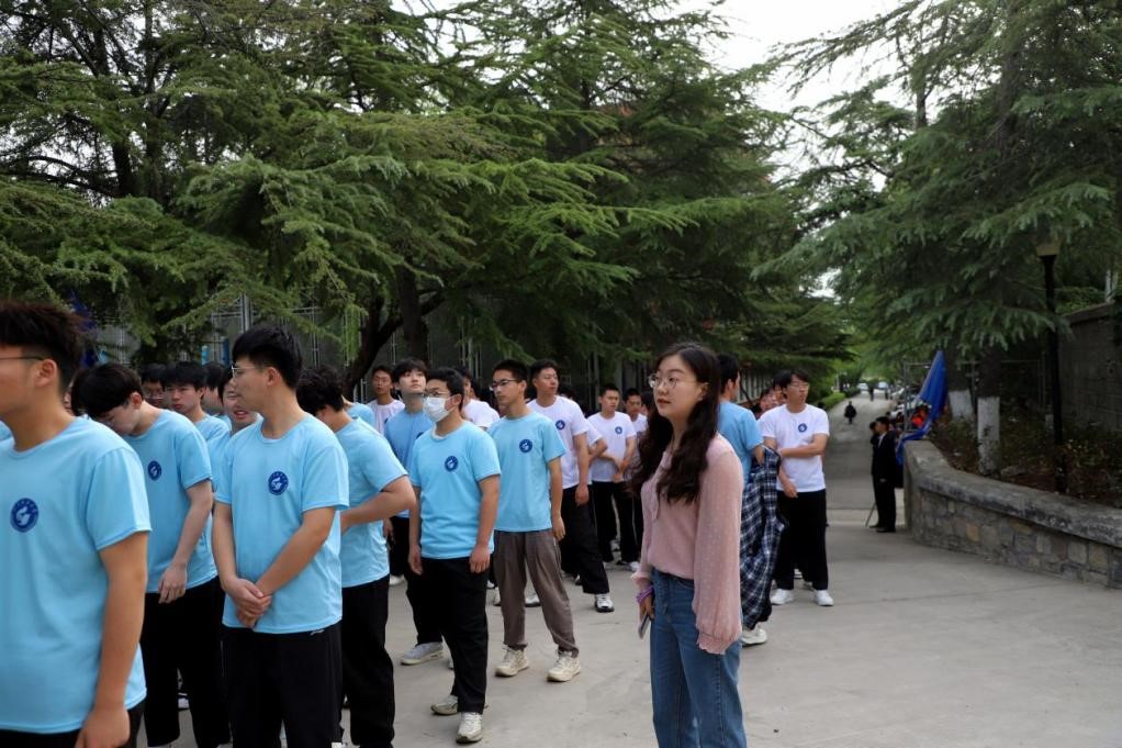 随后,她来到方阵集合处,站在青松翠柏的操场入口处,在队伍前方仔细清点人数,逐一比对间隔距离,利落地纠正着同学们的步伐节奏“提起精气神,跟着节奏走,保持好前后的距离,步子迈开点……”她不断提醒同学们为入场做好准备。