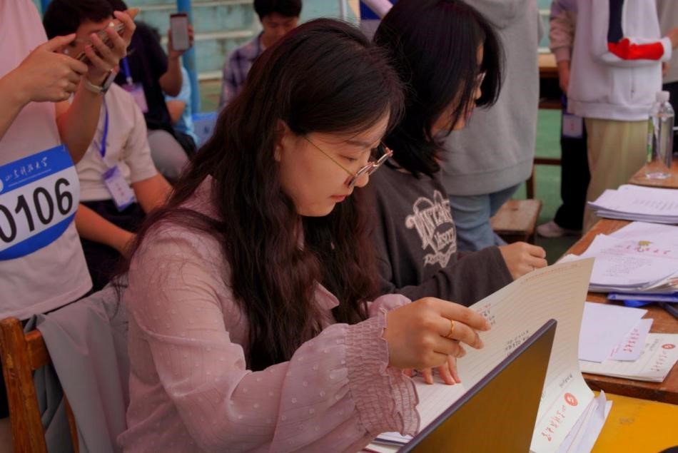 开幕式结束,她便马不停蹄地赶往学院志愿服务岗,指导同学们撰写新闻稿和加油稿。“这个标题可以再出彩点,把比赛的激烈氛围体现出来,再试试。”“这个加油稿一定要及时收集起来给主席台报送,注意不要超过各个项目的时间。”从镜头拍摄、标题拟定到内容撰写,从文字精炼到情感表达,她一一给出细致的建议,认真审核加油稿内容,帮助同学们用文字传递运动会的激情与感动。