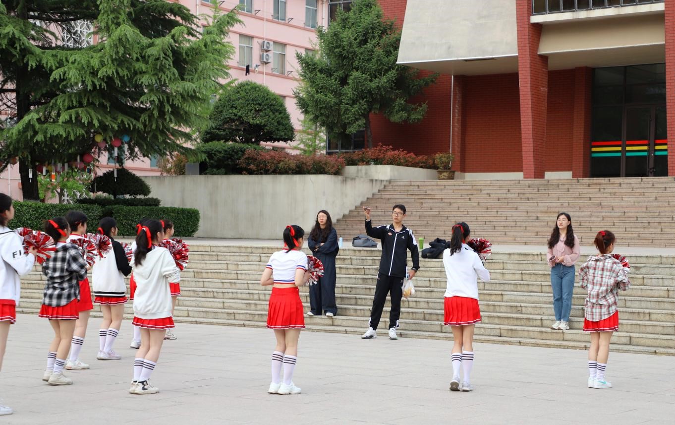 在她一遍遍的悉心指导下,队伍越来越整齐,同学们虽然疲惫,但动作愈发有力,步伐更加整齐,手中花球在阳光下闪烁,如同青春的火焰,在空中绽放出绚丽的色彩。“累是累,可看到队伍越来越整齐,成就感一下子就上来了!”另一名同学笑着说道,眼神中满是对即将到来的表演的期待。
