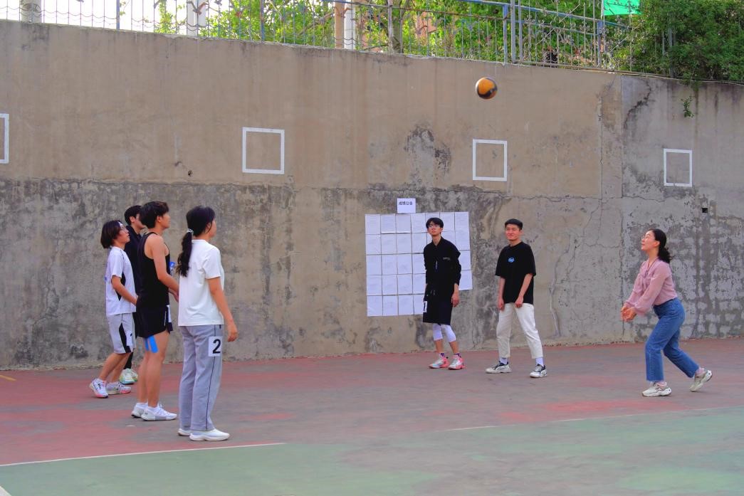 当同学们的欢声笑语逐渐消失在操场,排球场暖黄色的灯光却仍在闪烁——她正快步穿过草坪,踏上通往排球场的石阶。是的,此时她的工作仍没有结束,正在匆忙赶往排球场,为即将到来的师生排球赛精心练习。