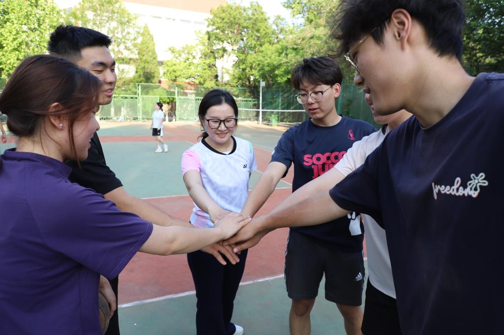 当中场休息结束的哨声响起,她率先将手高举,带领队员们迅速围成一圈。队员们的手掌层层叠放在中心:“一二三,加油!”众人齐声高呼,声浪冲破赛场,凝聚的不仅是掌心的温度,更是团队破局而上的决心。