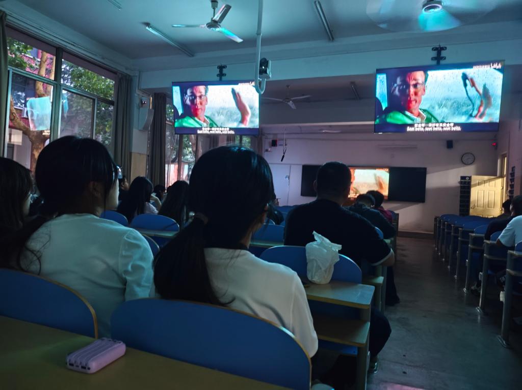 观影现场,随着灯光渐暗,暴雨倾盆的音效与摇晃的汽车旅馆画面瞬间将同学们带入紧张氛围。影片中,被困在密闭空间的陌生人接连遭遇离奇死亡,充满张力的对话、惊悚的场景切换,引得现场惊呼不断。随着主角身份的层层反转,大家时而皱眉思索,时而低声讨论,沉浸在影片所营造的心理迷宫之中。同学们在感受电影魅力的同时,也在紧张的学习生活中获得了难得的心理放松。