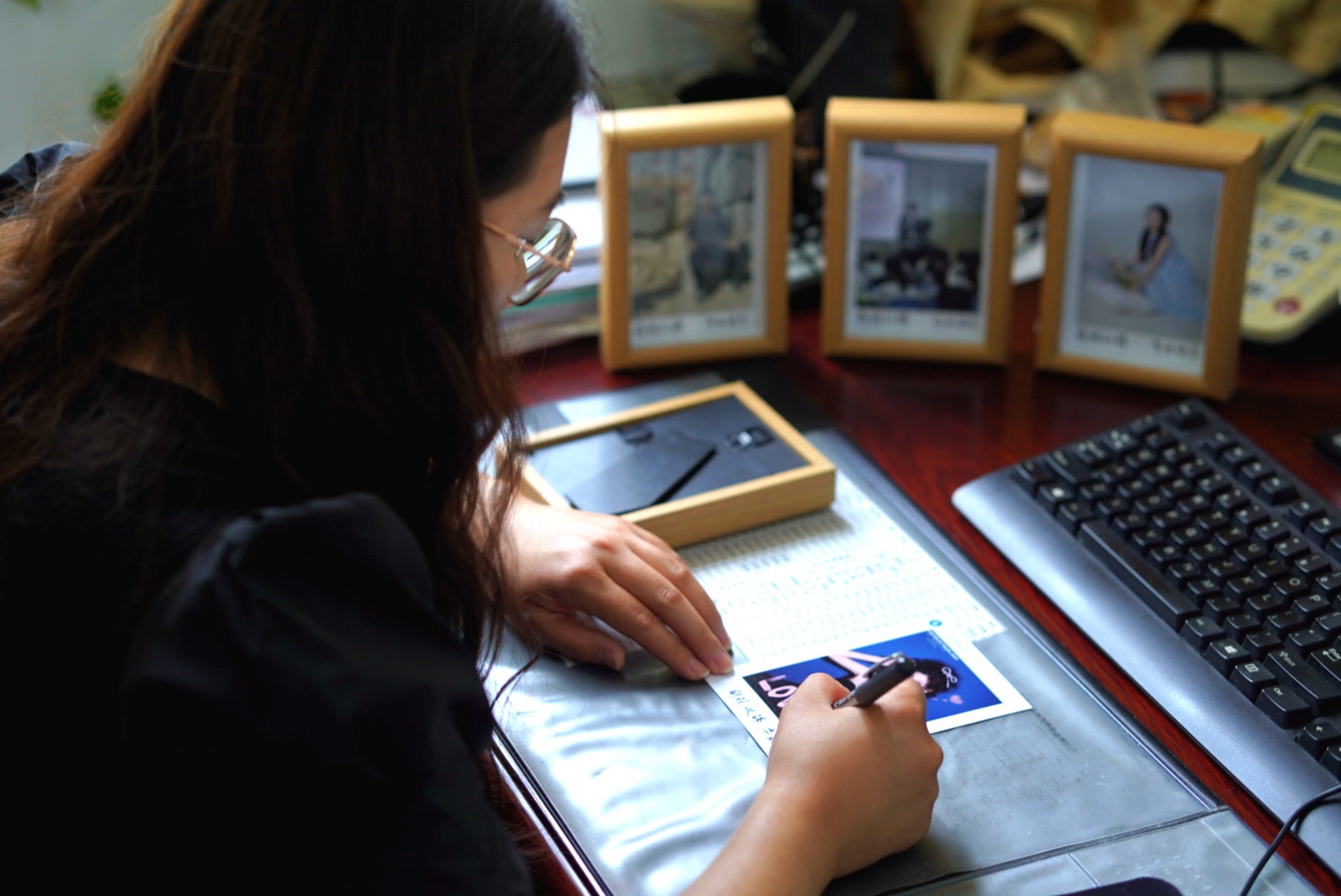清晨的阳光穿过窗棂,在办公桌上投下斑驳的光影。曹园伏案执笔,在每一张照片上认真书写:“前程似锦,毕业快乐”。这份带有手写温度的照片,是毕业行囊中最温暖也最珍贵的物品。桌旁整齐摆放的毕业礼物,每一份都承载着母校的殷切期盼,也是对同学们大学生涯最深情的告别。