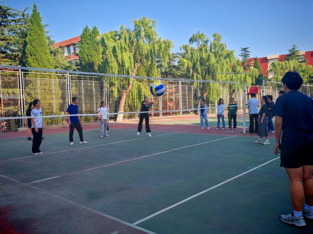 夕阳为排球场披上金色纱衣,一场别开生面的欢送毕业生师生趣味排球友谊赛正在上演。曹园换上运动装,与学生们在球网两侧尽情挥洒汗水。当最后一球尘埃落定,沾满尘土的球鞋、泛红的脸颊和意犹未尽的欢呼,都在诉说着最动人的师生情谊。