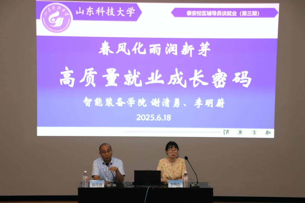 谢清勇以“春风化雨润新芽——高质量就业成长密码”为题,围绕当前就业形势、毕业生求职现状、就业指导难点展开交流,分享了在精准帮扶、校企合作、政策解读等方面的经验做法。他强调就业观念的重要性,勉励学生树立正确择业观,脚踏实地、科学规划,实现高质量充分就业。随后,李明蔚从传统就业渠道、基层就业、创新就业和研究生考试四个方面进行解读,指出在当前就业形势下,同学们要积极准备,及时调整求职心态,自信地参加到职业竞聘之中。