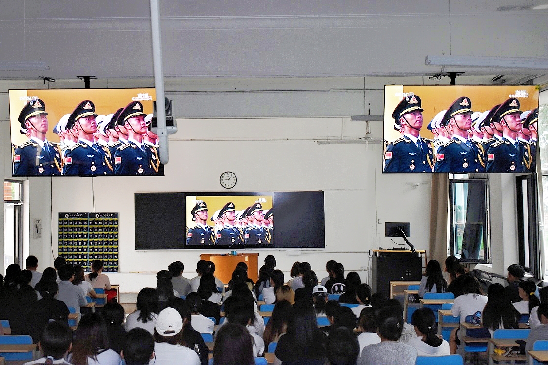 上午9时,庄严的礼炮声响起,观看现场瞬间肃静,同学们全体起立,共同见证这一庄严的历史时刻。观看过程中,同学们全神贯注,神情庄重。受阅部队整齐划一的步伐、新型国产主战装备的震撼亮相、空中梯队的磅礴气势,无不引来现场的阵阵赞叹。