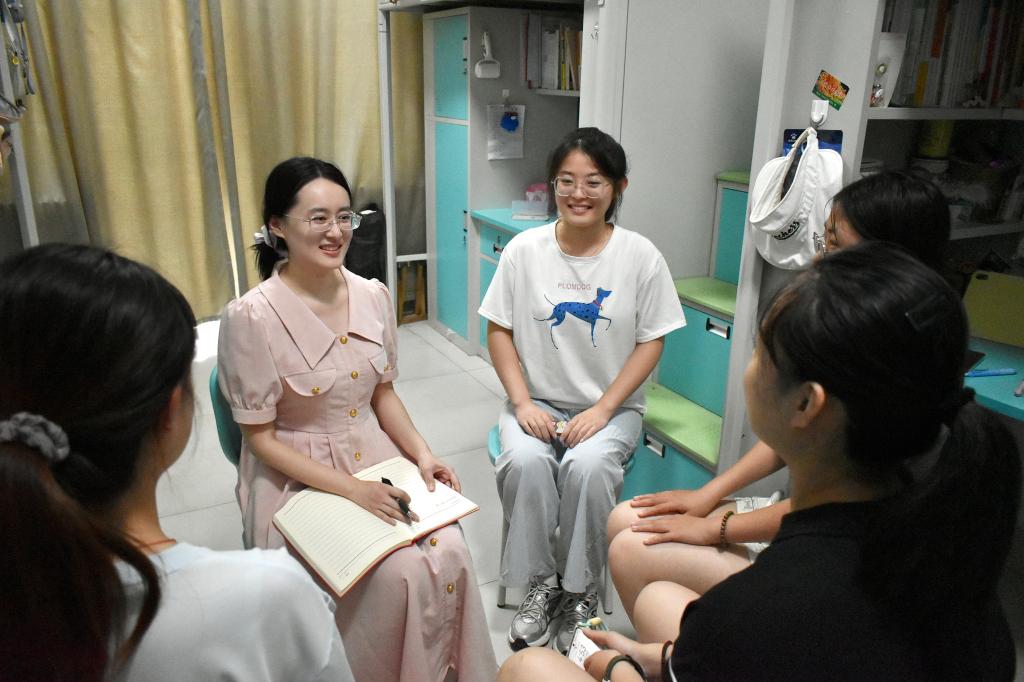 暮色漫进宿舍楼时,彭潇已坐在学生宿舍的书桌旁。面对学生关于学业规划、职业选择、生活困扰的提问,她耐心解答。“大三的专业课程确实难度提升了,可以采用优先级排序法,试试这样规划时间……”她努力帮助学生破解“课程多、压力大”的困境。谈及职业规划,她提出要梳理“大三能力储备清单”:“你们看,专业证书考取、实习经历积累要循序渐进……”她详细记录下学生的需求与困惑,每一笔都承载着对学生的关怀。