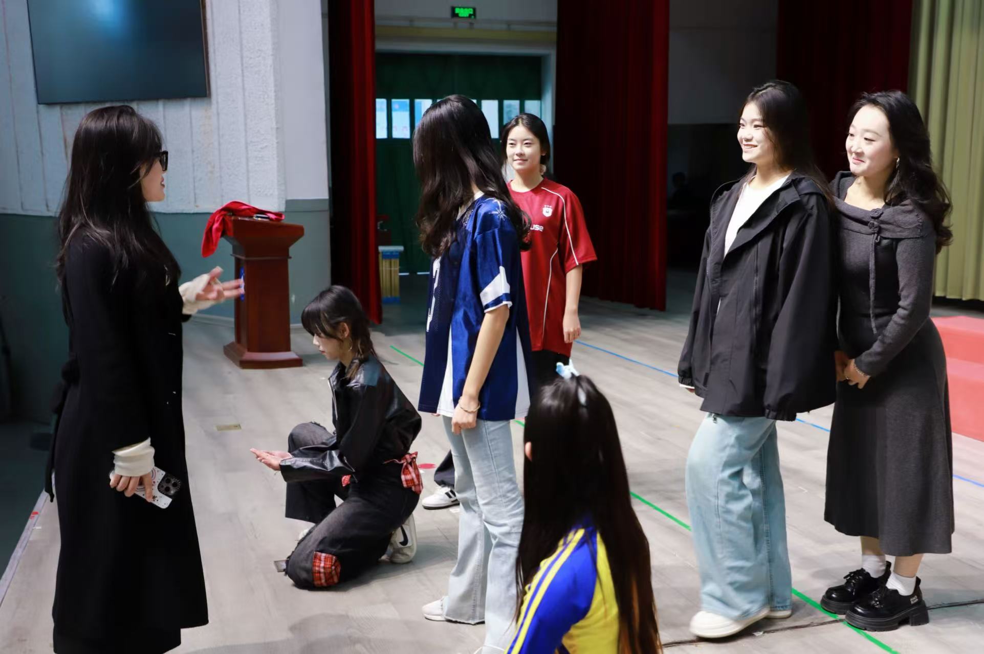 中场舞蹈,李梓祎站在排练队伍前方,目光紧紧跟随演员的动作,不时举手示意暂停指导。“这里的队形可以再紧凑一些,这样能更好地凸显整体美感”“转身动作要保持同步,注意跟上节奏卡点”。针对个别演员的站位偏差问题,她主动走到身边轻声指导,还亲自示范调整姿势。此外,她还协调志愿者帮忙搬运道具、调整排练灯光,凭借志愿者般的专业态度与十足耐心,不断优化每个细节,力求呈现最佳效果。