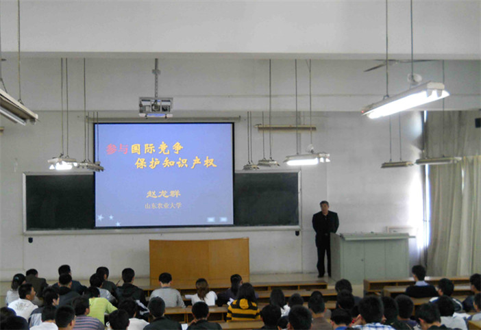 赵龙群教授多年从事知识产权研究工作,参加过山东省知识产权战略的制定工作,经常到各地作知识产权报告,具有丰富的理论水平和实践经验。讲座中,赵龙群教授就国际竞争中的知识产权保护、专利授予的实质条件、专利申请当中的需要注意的问题等方面,为同学们作出详细的讲解。同时,赵教授鼓励同学们一项发明创造并不是高不可攀的,他希望同学们在学习、生活中要善于琢磨,善于发现,求真求实,不断创新。赵教授渊博的学识、生动幽默的讲解不断赢得同学的阵阵掌声。