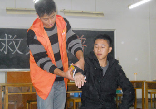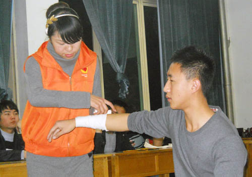 讲座上,马老师和卞老师首先结合最近发生的上海重大火灾事故向同学们介绍了火灾的危害性以及冬季如何预防火灾,随后分别为同学们讲解了火灾发生时如何逃生自救等基本消防知识,并为大家现场演示了三角带、绷带等常用医疗用品的包扎方法。同学们根据老师的讲解,互相帮助,相互配合,学得很是认真。