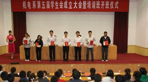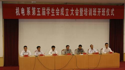 9月28日下午,机电工程系第五届学生会成立大会暨第五期学生干部培训班开班仪式在4号楼报告厅举行。机电工程系党总支书记张恩生,主任张建中,党总支副书记、副主任刘相明,系团总支书记谢清勇,第四届学生会主席张志亮,第五届学生会主席常宝奇出席会议并在主席台就坐。系团总支全体辅导员、学生会全体成员及班级干部代表参加了会议。会议由系学生会秘书长周立志主持。