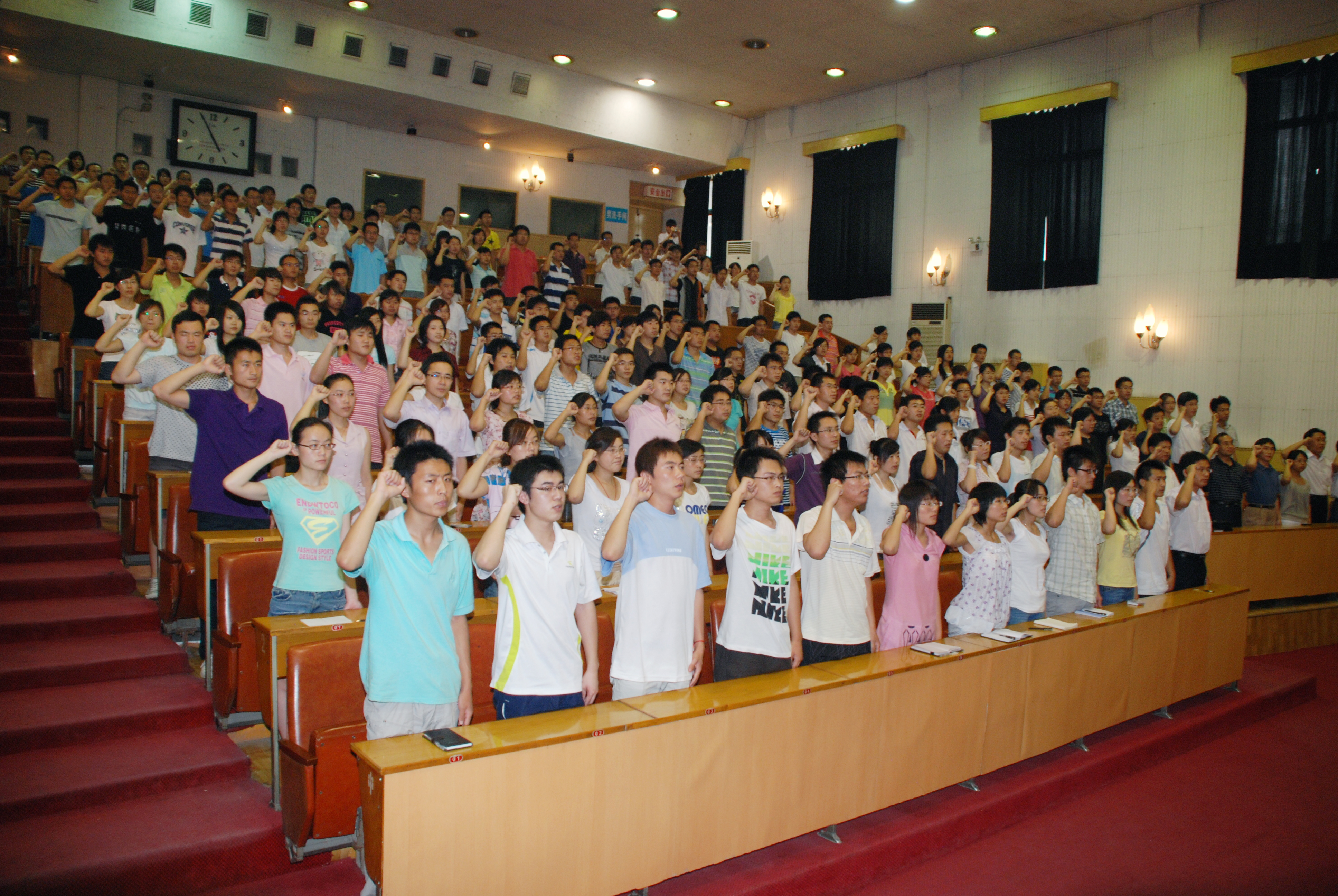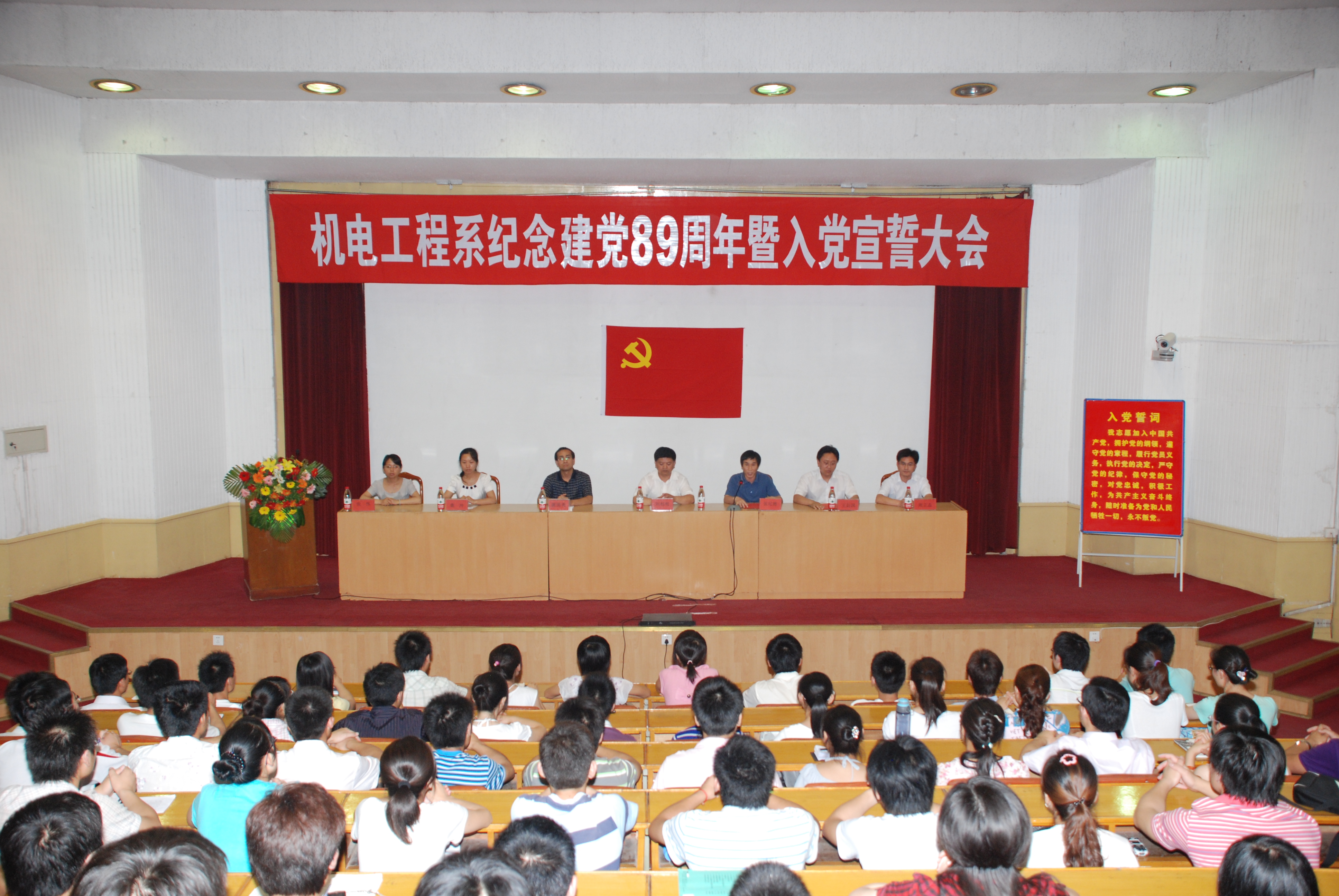 为庆祝建党89周年,体现党员的先进性,做好新的一批党员的入党宣誓工作,6月18日下午,机电工程系庆祝建党89周年暨入党宣誓大会在4号楼报告厅隆重召开。系副书记、副主任刘相明,系团总支书记谢清勇以及各学生党支部书记出席了大会并在主席台就坐,全系所有党员同志参加了会议,大会由系党政办公室主任张纪德主持。