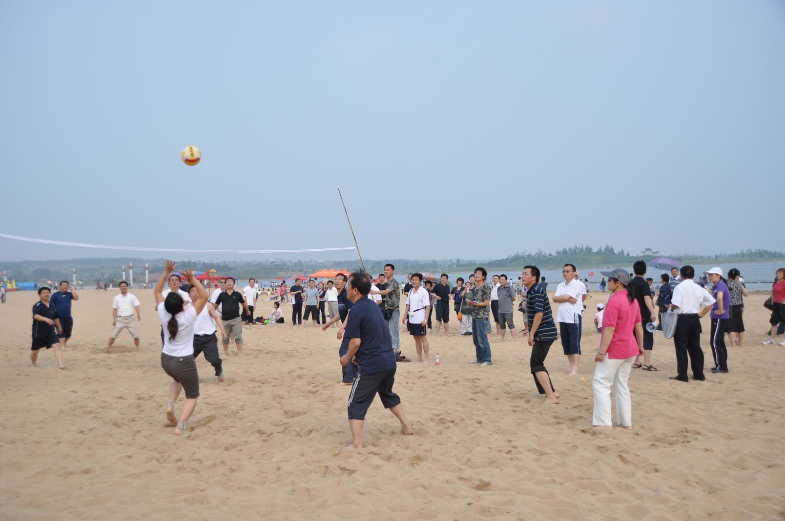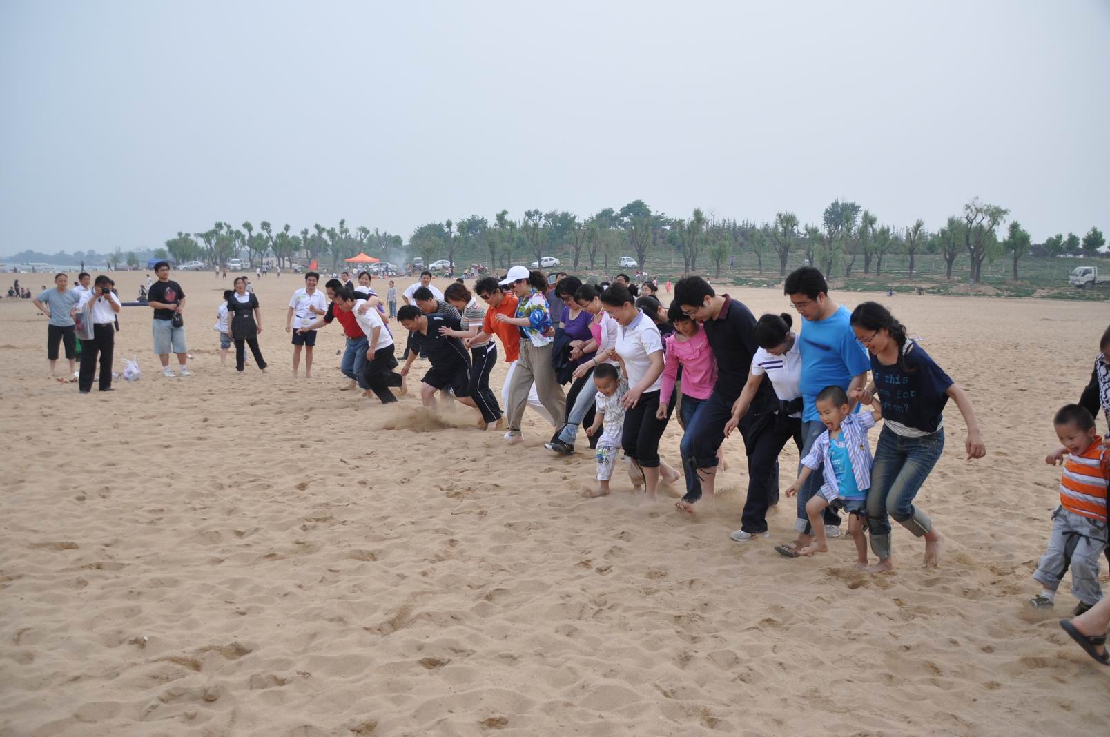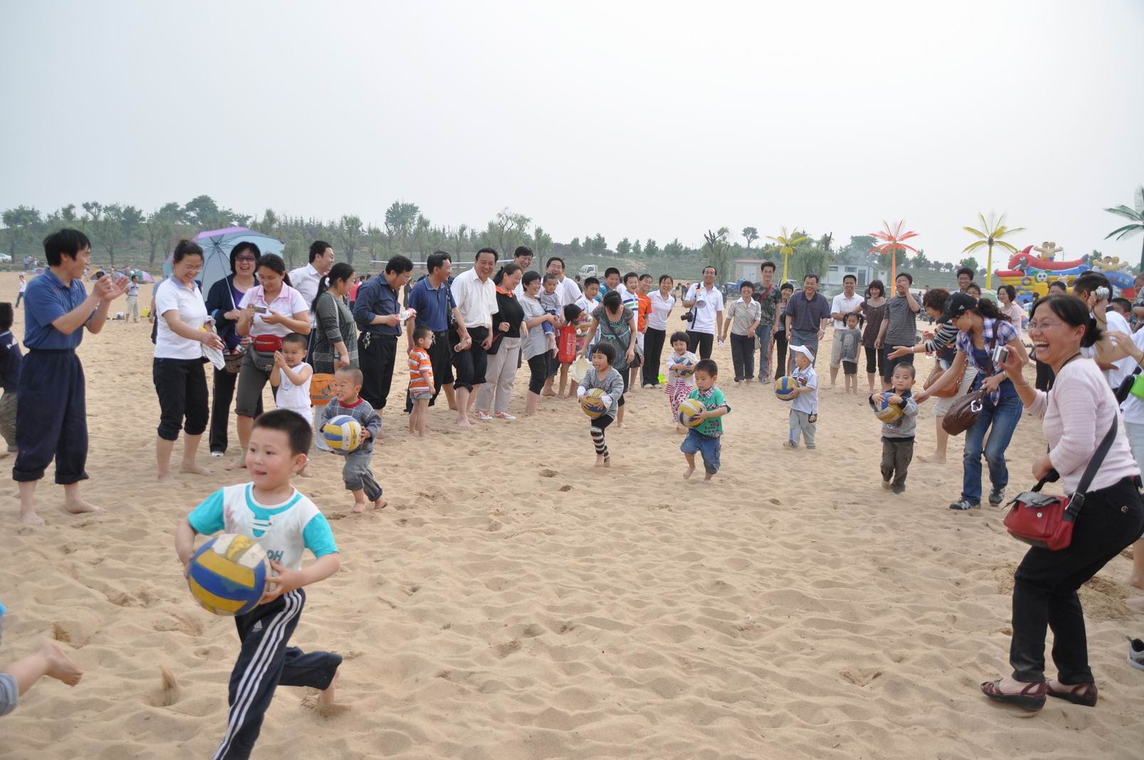 当天阳光明媚,风和日丽,机电系职工及家属近200人兴致勃勃来到天颐湖公园,在天颐湖公园开阔的沙滩上,组织了教研室(工会小组)为单位进行的沙滩排球团体比赛;三口之家(孩子小学以上)、夫妻两人及其他个人自由组合方式进行的结伴而行(即绑腿)比赛;孩子上幼儿园的家庭抱孩子跑、小学及初中组小孩托球跑、成人组托球跑及幼儿园以下孩子组抱球跑比赛。在比赛过程中,不论是队员还是观众,都热情高涨,队员认真比赛,观众呐喊助威。我们的比赛也感染了其他游客,也驻足为我们的队员加油助威。赛后系领导为参赛人员颁发了奖品及纪念品。