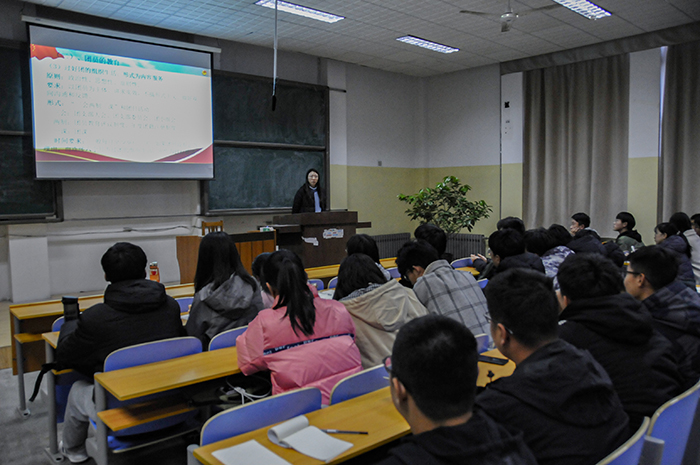 会上,曹园分别从团员的发展、团员的教育与管理、共青团的工作定位、团支部的工作项目四方面向全体学生干部展开介绍。曹园首先向同学们明确了团员身份的概念,介绍了成为团员、拥有团籍的具体要求。随后,曹园分别从性质、特征、作用三个角度阐述共青团的工作定位,并联系“四导五岗”工程帮助团支委成员深化理解共青团工作定位。最后,她要求团支委成员开展工作时要恪守五岗:学习岗、宣传岗、实践岗、服务岗和创新岗,要以学为本、践为末、细为要,从实现思想引领的内化、坚持实践引领的固化、贯彻价值引领的路径三个维度做好共青团的工作,全心全意服务同学。