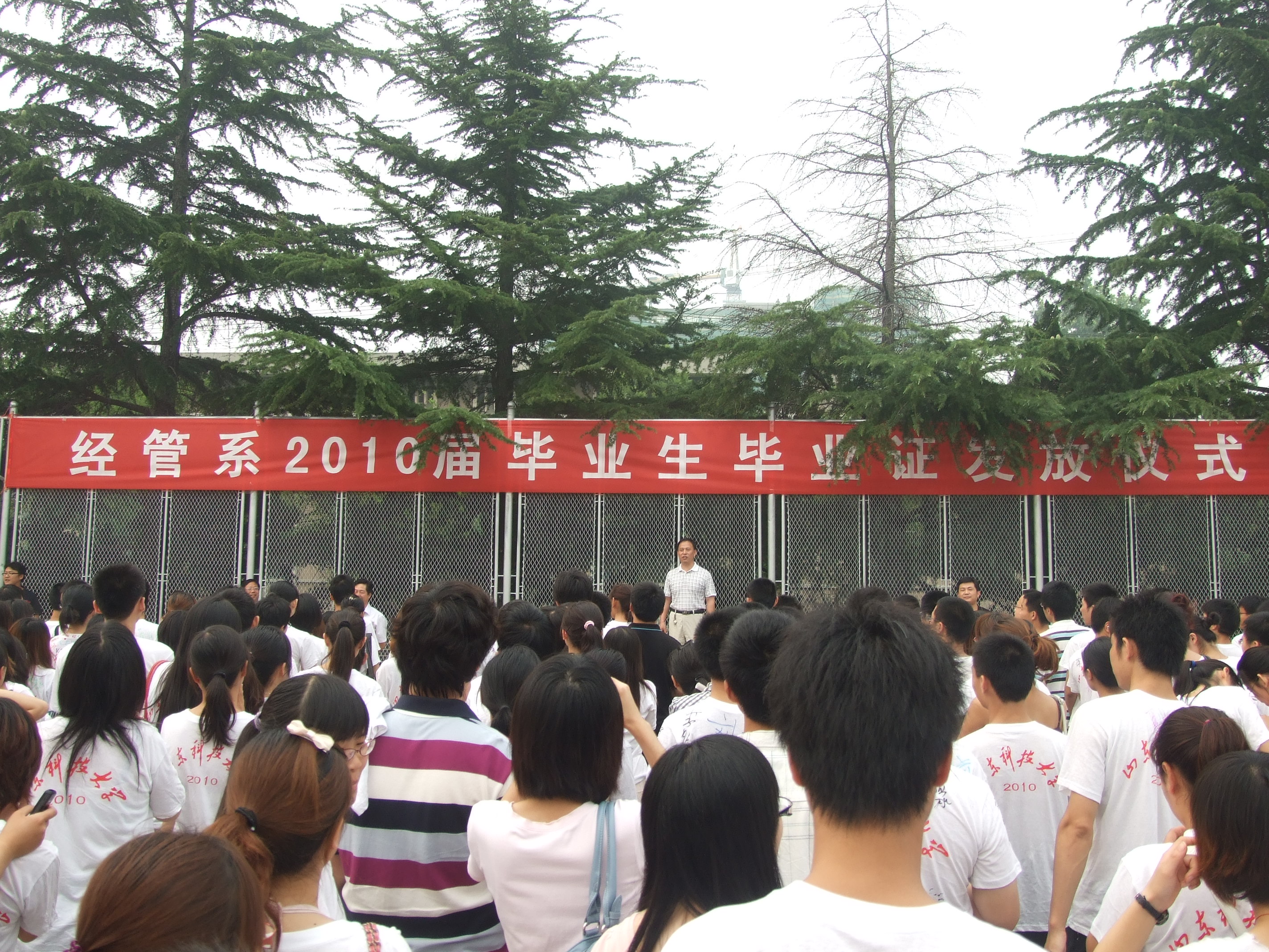 6月24日上午,经管系在西校园举办了2010届毕业生毕业证发放仪式,经管系党总支书记韦安永、经管系主任周洋、副主任张振华等领导和老师出席了发放仪式,全体毕业生参加了发放仪式,仪式由经管系党总支副书记、副主任陈福刚主持。