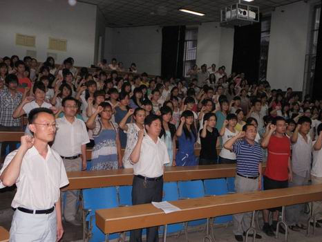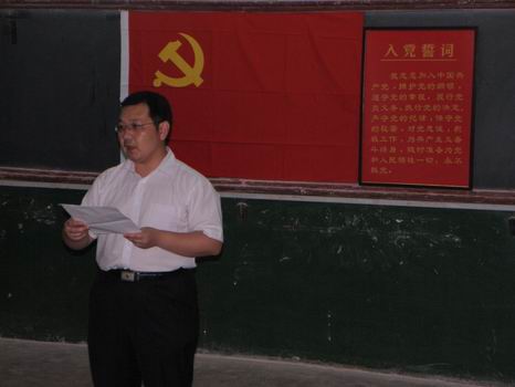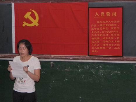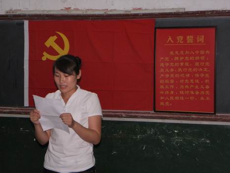 石慧作为新党员代表在仪式上发言,坚定的语气中,表达了对党的忠诚和志愿加入党组织的决心,并作出郑重承诺: 严于律己,发挥模范带头作用;勤奋学习,提高专业技能;加强个人素质的培养,保持党员先进性。李蓉蓉作为毕业生党员代表向所有毕业生发出倡议:一、以身作则,留下美丽身影,文明着装,文明行为;二、身先士卒,留下美丽宿舍。珍藏一份整洁,珍藏一份回忆;三、热心服务,留下美好印象。号召所有党员积极行动,用每一件小事作为一个美丽的散场;四,饮水思源,留下美好传统,倡议所有党员向学弟学妹们传授学习等方面的经验,建立长期沟通机制,同时开展“毕业捐物献爱心”活动。