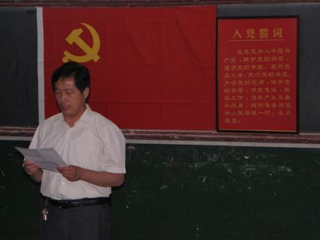 在国际歌中,与会人员全体起立,全场气氛严肃庄重,新党员入党宣誓暨老党员重温入党誓词活动缓缓拉开帷幕。在团总支老师周广文的带领下,全体党员宣读入党誓词,表达了永远跟党走的决心。