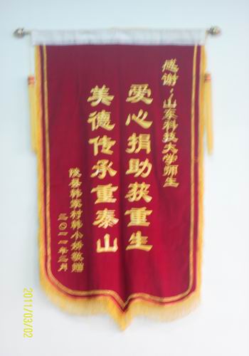 “爱心捐助获重生,美德传承重泰山”,韩小娇家人为答谢经管系所有师生赠送锦旗写道。韩小娇同学重返校园,依然坚强,依然乐观,其战胜病魔的勇气值得在校每一位大学生以此作为榜样。相信,战胜磨难的韩小娇在众多师生的帮助下,定能完成学业,不断进步,实现最终的梦想。(作者:赵璐 于婕 责编:甄惠)
