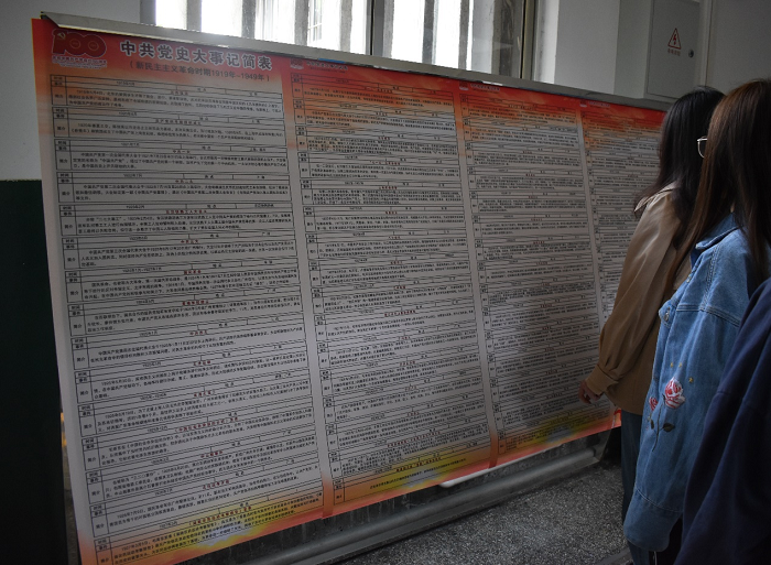 胸怀千秋伟业,恰是百年风华。展板展示之初,精确的历史脉络和精炼的文字介绍即引得同学们频频驻足观看。展板上,从1919年到1949年,新民主主义革命时期的重大党史事件让同学们热血沸腾,提高了同学们学习党史的热情。大家纷纷表示,要进一步深入学习党的历史,不忘初心,坚定自身理想信念,让青春在奋斗在闪光。