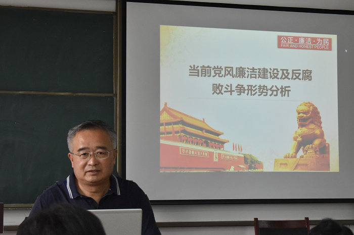宋传文从国际国内反腐败形势、近年来中纪委主要工作任务、落实全面从严治党主体责任、完善监督体系等四个方面,对加强党风廉政建设进行了深入解读,并对学校纪委基本组成、职责及工作流程进行讲解。