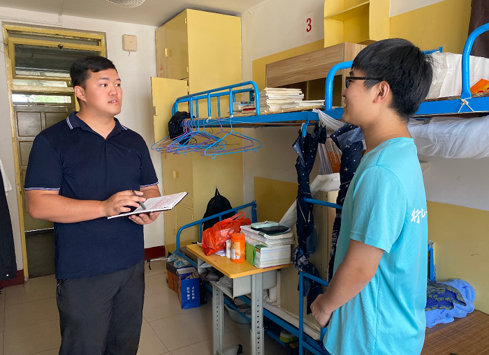 为进一步落实疫情防控工作,了解暑期留校学生的思想动态,及时解决学生生活、学习上的问题和困难。8月3日上午,财经学院团委辅导员张泽到5号宿舍楼看望我院暑期考研留校学生。