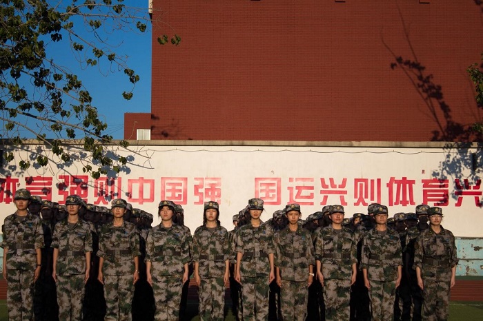 9月8日,天气晴朗,万里无云,财经学院2021级新生在操场进行着第四天的军事训练。