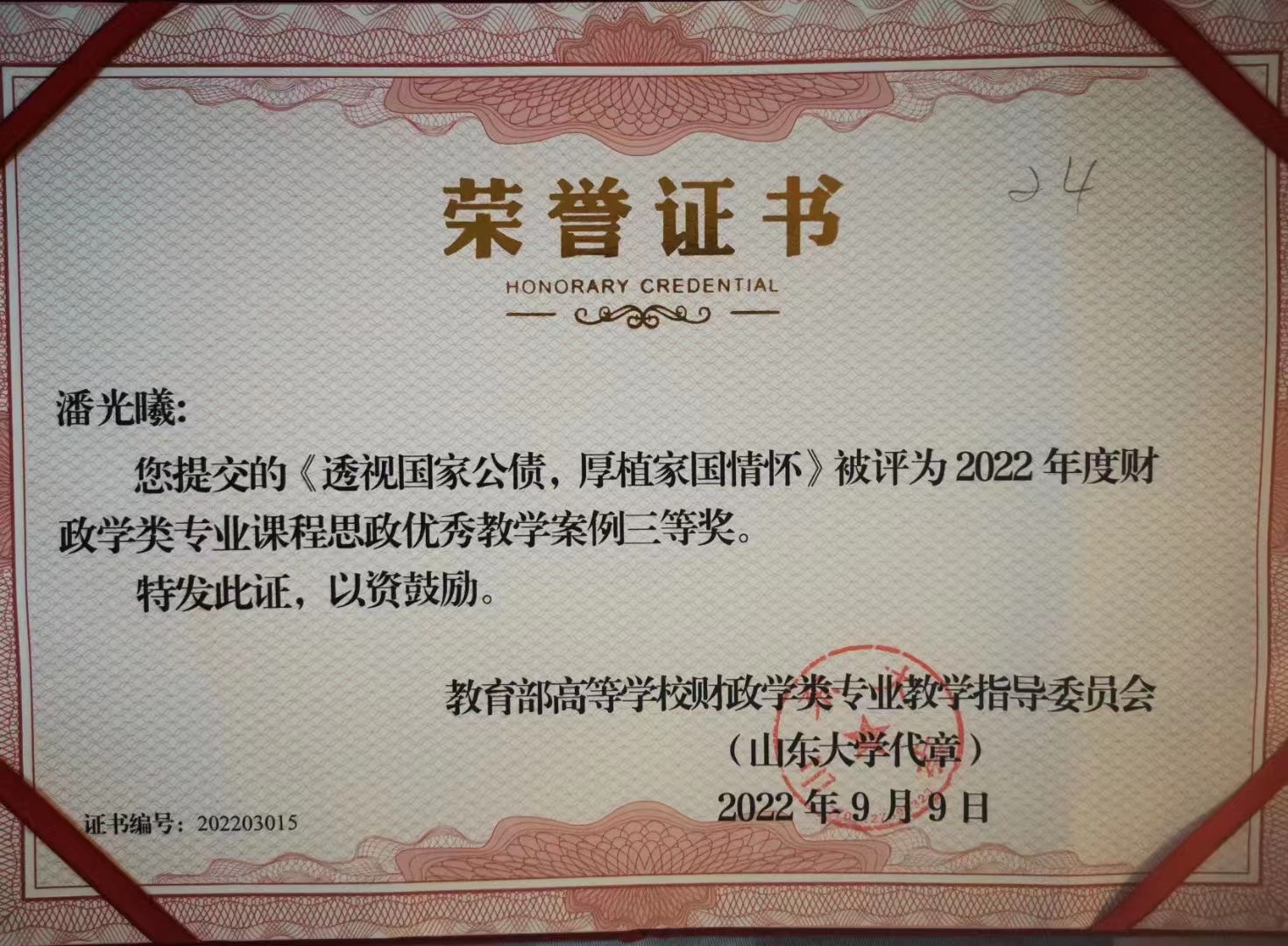 近日,教育部高等学校财政学类专业教学指导委员会公布了财政学类专业课程思政优秀教学案例评选结果。全国38所高校提交的94个案例,经专家组初审、复审和会议评审,共评选出一等奖10个、二等奖15个、三等奖21个。财经学院潘光曦老师编写的思政教学案例《透视国家公债,厚植家国情怀》荣获三等奖。