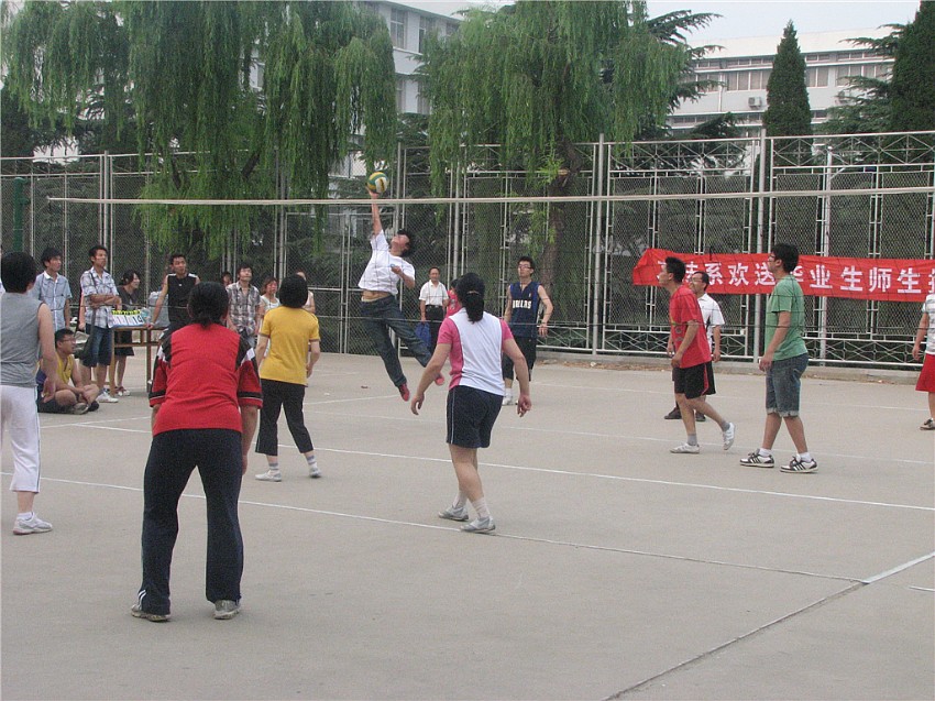 教工代表队和毕业生代表队均对比赛高度重视,比赛前进行了多次有针对性的训练,希望在比赛时取得好的成绩。本次比赛采取男女混合组队的方式,实行5局3胜制。比赛开始后,双方都集中精力,水平不分伯仲,比赛一度进入白热化状态,比分交替上升。在比赛过程中,双方队员各展绝技,队友们默契的配合,大力的扣杀,严密的防守,蓄发的进攻,让小小的排球在天空中划出一个个完美的弧线。最后,教工代表队还是技高一筹,以3:1赢得了比赛。