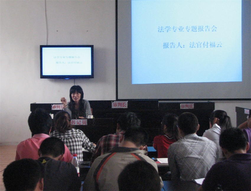 520下午,文法系在模拟法庭举行法学专业报告会。此次活动邀请了泰安市岱岳区人民法院行政审判庭法官付福云。她为09级法学专业学生做了一场法学专业精彩的报告。