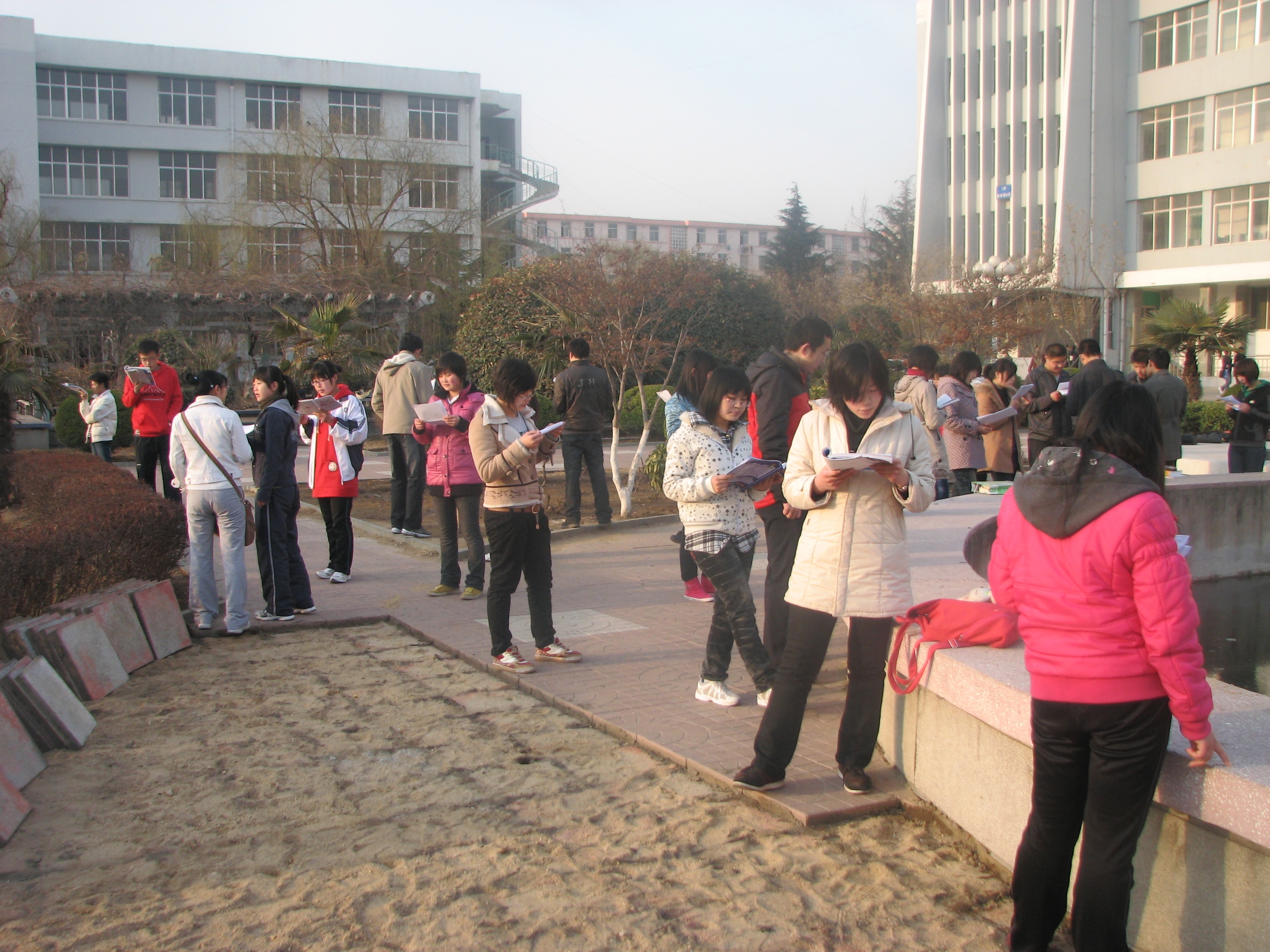 为了培养同学们学习英语的兴趣,提高英语,文法系英语协会近期组织开展了英语晨读活动。英语协会会员每天早上7:10至7:50在鹰湖旁边朗读英语。他们每天坚持早起,沐浴在朝阳中快乐读书,成为科大校园一道亮丽的风景线。