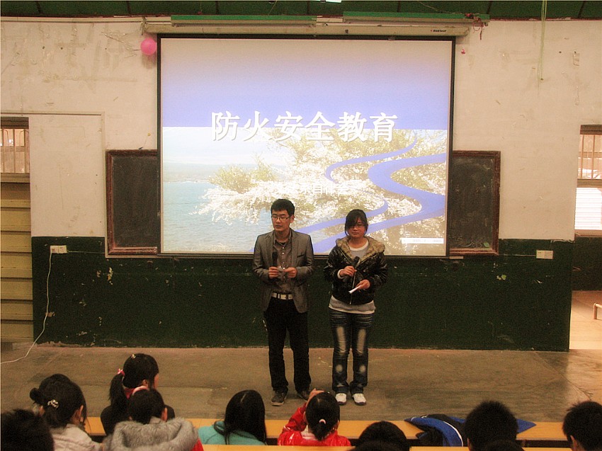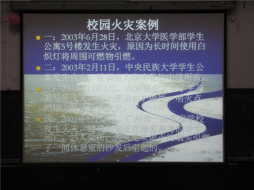 活动一开始以视频的形式先后展示了发生在上海胶州路的特大火灾及上海商学院火灾,火灾均是由于人员的疏忽大意而造成的。尤其是上海商学院的火灾,竟是由于学生使用“热得快”导致的,触目惊心的火灾现场使在座的每一位同学都感受到火灾的无情,并深刻认识到只有严格遵守校规校纪和各项规章制度并掌握一定的防火自救技巧才能确保安全的道理。随后,结合我校实际情况,将重点放在高楼防火与火灾逃生方面。文法系自律会学生干部着重强调了学生应遵守学校规章制度,不得在宿舍吸烟、使用明火和违禁电器,以防止火灾的发生。最后,又生动地展示了灭火器的使用方法及高楼逃生的技巧,深刻剖析了错误的火场逃生方法,并向现场学生详细的讲解了逃生的正确方法。