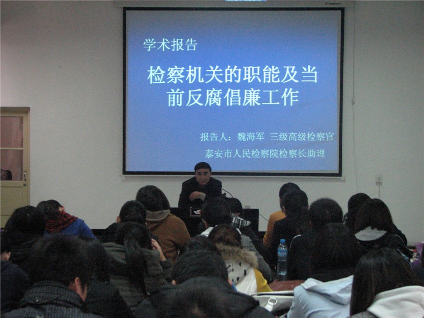 11月2日下午,泰安市人民检察院院长助理,三级高级检察官魏海军应邀为文法系学生作了题为《检察机关的职能及当前反腐倡廉工作》的学术报告,报告会由文法系法学教研室主任刘辉主持。
