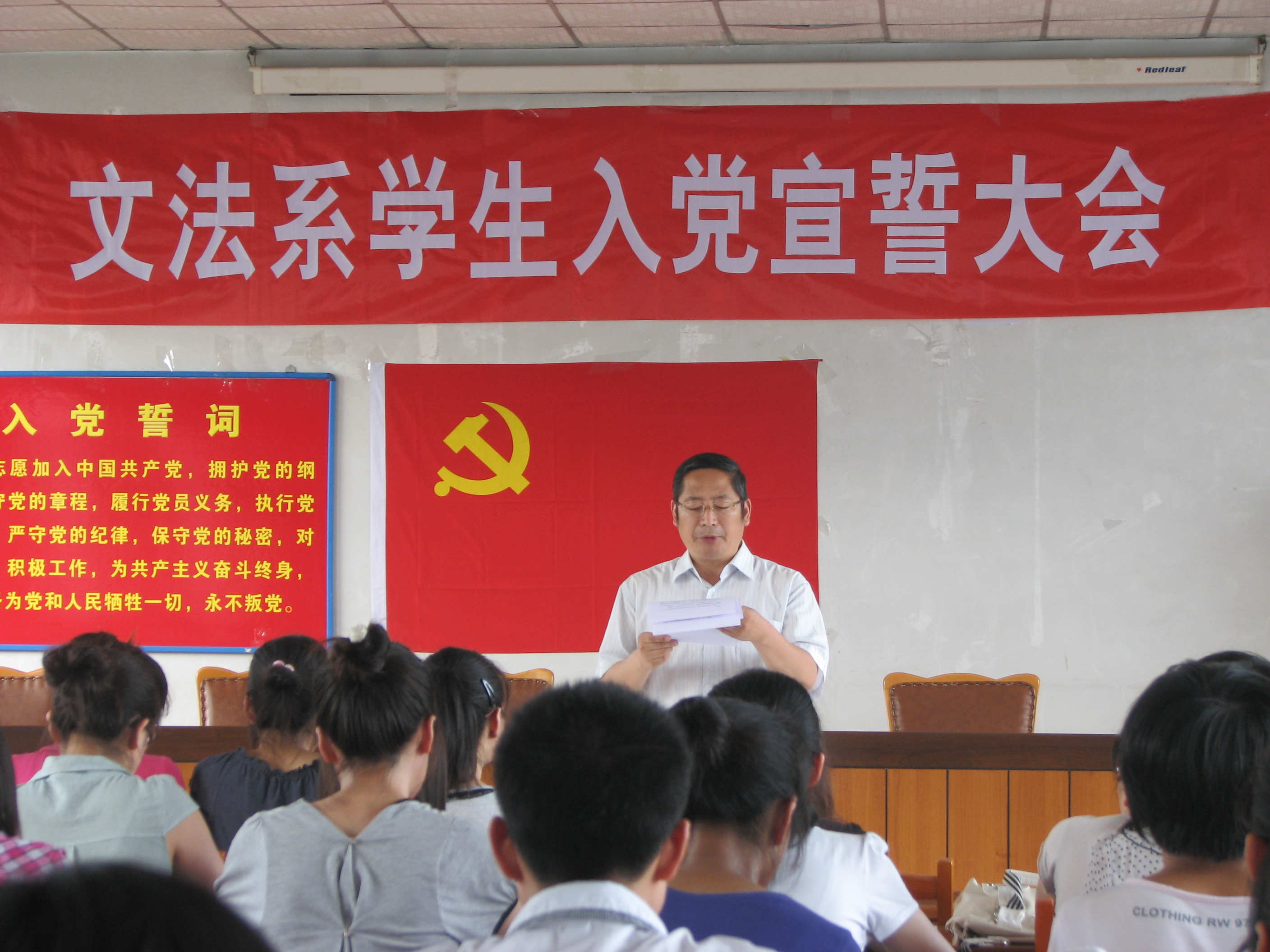 620下午文法系在办公楼301举行新党员入党宣誓和老党员重温入党誓词仪式,文法系党总支书记马福泉、团总支老师桂自品和全体学生党员以及部分入党积极分子参加,仪式由学生党支部书记郭涛林主持。
