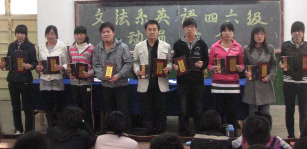 系党总支副书记裴国栋宣读了《文法系08级学生学习进步奖获奖同学名单》,张聪睿等21名学习进步明显的同学受到表彰。这也是文法系首次开展学习进步奖评选表彰活动。接着由在09年英语四级考试中取得优异成绩的法学07-1班张甜甜同学发言,与大家分享备考心得。