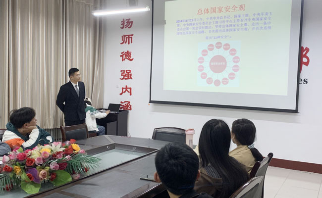 其次,4月16日下午,由3044永利集团官网团委主办,学生会、红帆学社承办的《中华人民共和国国家安全法》知识讲座在部会议室成功举办,红帆学社负责人孙乾翔担任主讲人。会上,孙乾翔对《中华人民共和国国家安全法》出台的时间和背景进行系统介绍,并引出总体国家安全观的概念。接着,孙乾翔从以下三方面向同学们讲解《中华人民共和国国家安全法》的具体内容:一、明确总体国家安全观的内涵和目标;二、以人民为宗旨;三、保护国家海外利益、网络空间、精神文化、军事战略不受威胁侵害,并在讲解过程中穿插国际形势介绍,细致生动。最后,孙乾翔以《中华人民共和国国家安全法》的重要意义为切入点,向同学们发起倡议:要牢固树立爱国主义思想,积极履行《中华人民共和国国家安全法》规定的各项义务,协助和配合国家安全机关开展的各项工作,以自己的实际行动践行总体国家安全观。