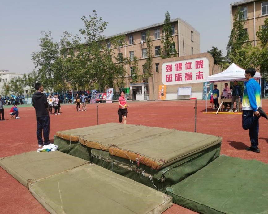 图为孙爱民带伤参加学生乙组女子跳高比赛