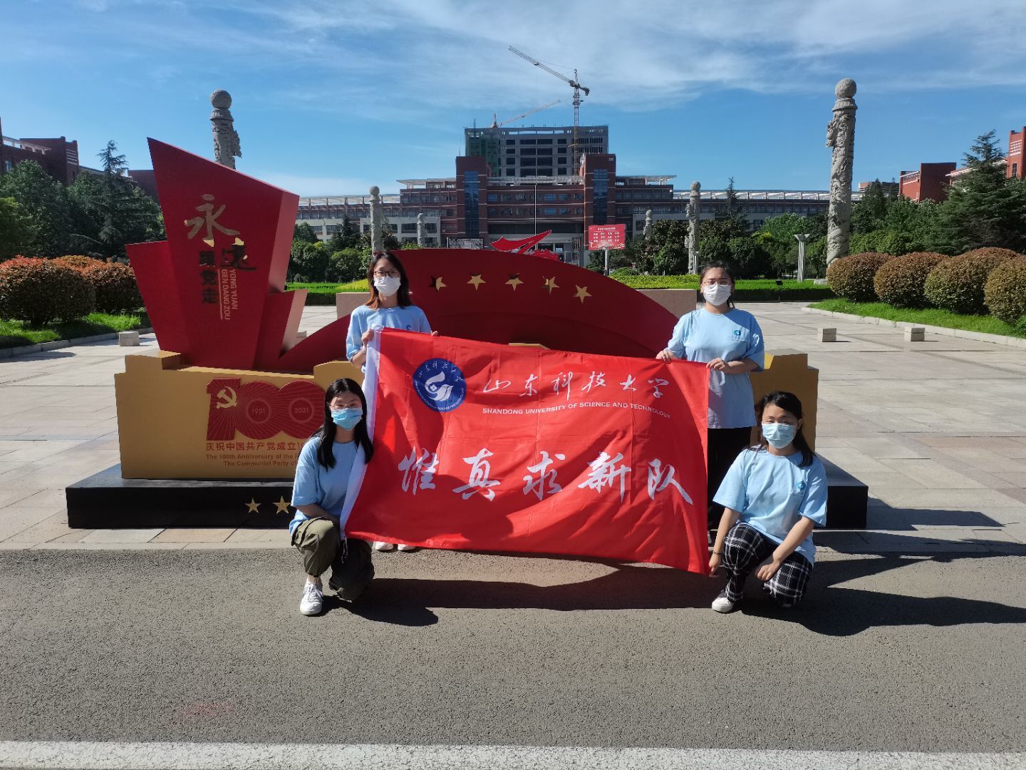 秉承为母校代言的宗旨,队员们预先在线上查阅搜集了大量资料并结合在泰安校区的所见所思,对我校的发展历史、校风校训、师资力量、优势学科、科研建设、知名校友等有了更全面的了解,这些方面为队伍实地参观青岛校区提供指南。在通过青岛校区的审批后,“惟真求新”母校代言队来到了科大主校区进行参观调研。今年正值中国共产党建党100周年和科大建校70周年,校园内处处充满了喜庆的氛围,标志性建筑、红色精神宣传栏、庆校艺术展等遍及校园。队员邓琳表示:“我们在参观过程中深刻感受到了学校七十载的发展变化,对于‘惟真求新’也有了更深刻地认识。另外,我们用大量照片记录了校园美景,包括校园建筑、餐厅、教室设施等,希望通过这次实践能更好地宣传科大特色。”