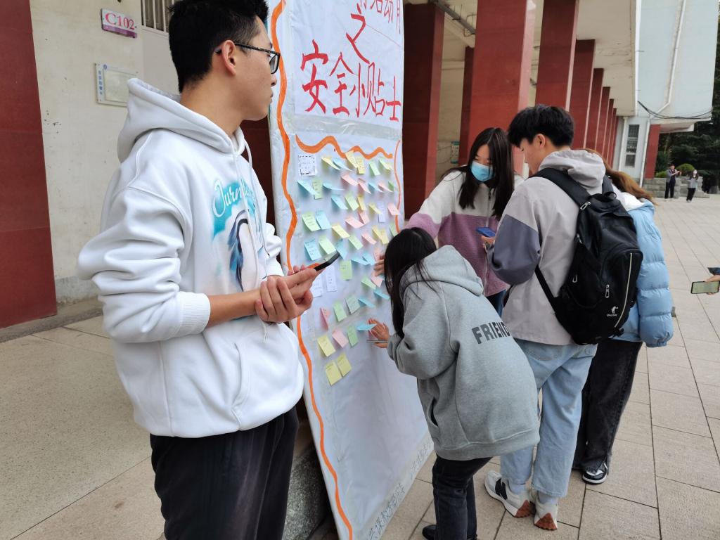 活动伊始,主办方对本次活动的流程做简单的介绍,引导前来参加活动的同学将安全小知识写下贴于展板上。展板前的同学们络绎不绝,他们通过思考与分析后,纷纷将校园周边存在的一些安全隐患和校园安全常识记录下来,互相探讨交流。活动结束后,自律督察部部长孙子怡表示:“通过阅读这次活动的小贴士,我们学到了很多安全知识,并体会到在生活中防患于未然的重要性,及时地为同学们敲响了警钟。”