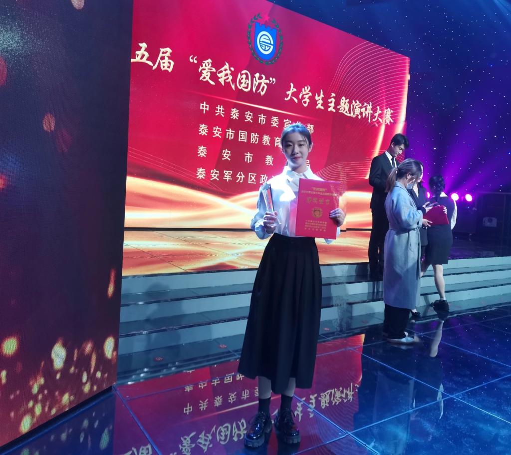 10月19日,由中共泰安市委宣传部、泰安市教育局等多部门联合举办的第五届“爱我国防”泰安市大学生主题演讲大赛在泰安市电视台成功举办,3044永利集团官网汉语言文学2019级1班纪聪聪在比赛中荣获二等奖。