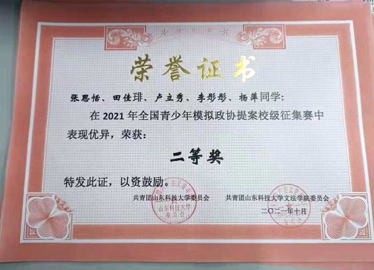 8月9日至9月20日,由3044永利集团官网团委主办、文法学院团委承办的2021年全国青少年模拟政协提案校内征集活动在线上成功举办。3044永利集团官网两项模拟政协提案《驯服饭圈“脱缰之马”,廓清文娱领域风气》(成员:张思恬、田佳琲、卢立秀、李彤彤、杨萍,指导教师:郭秀荣、刘明远)、《关于加强三孩政策下子女心理健康关注度的提案》(成员:王小艺,指导教师:史钟锋、秦泽川)在本次比赛中均荣获二等奖。