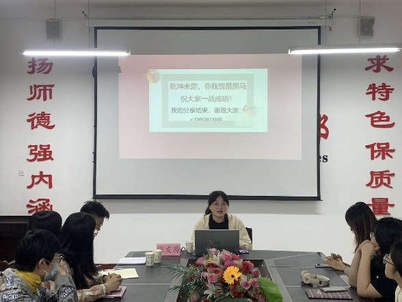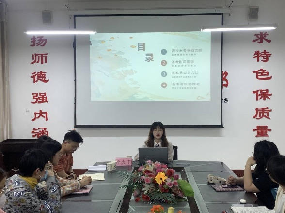 三位同学结合自身经历,从院校选择、学硕专硕的区别、双考抉择、备考时间安排等方面展开交流,向同学们分享考研和法考经验。他们认为,实现人生梦想有很多条路,但用知识改变命运是一条捷径,一条贯穿一生、终身受用的捷径。希望2019级考研同学在考研路上做到坚持不懈、克服浮躁,制定切合实际的考研学习计划,并脚踏实地、付诸行动。最后,他们向学学弟学妹提出三点建议:一、考研是一场持久战,保持积极乐观的心态,不要因为一时的低效而过度焦虑,放大痛苦的情绪;二、考研是一场身体战,锻炼身体、规律作息,保持身体健康是全力备考的前提;三、考研是一场自我战,坚定自我、精确规划,切勿因客观因素影响心态。