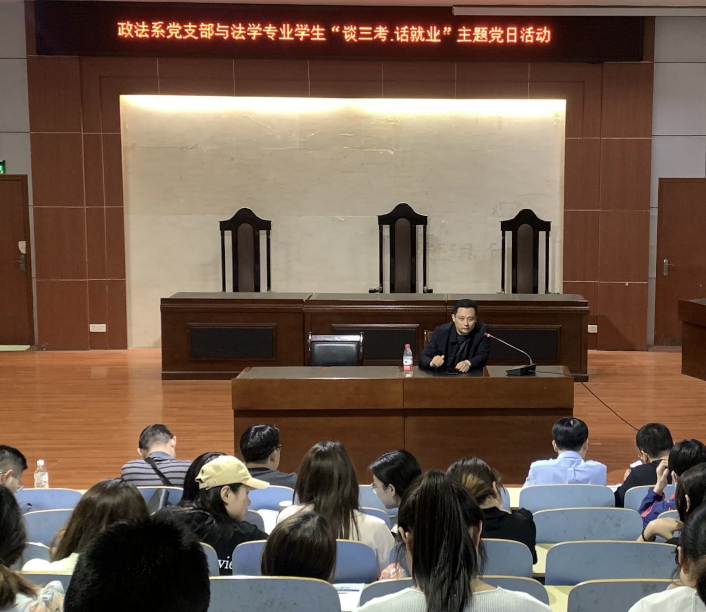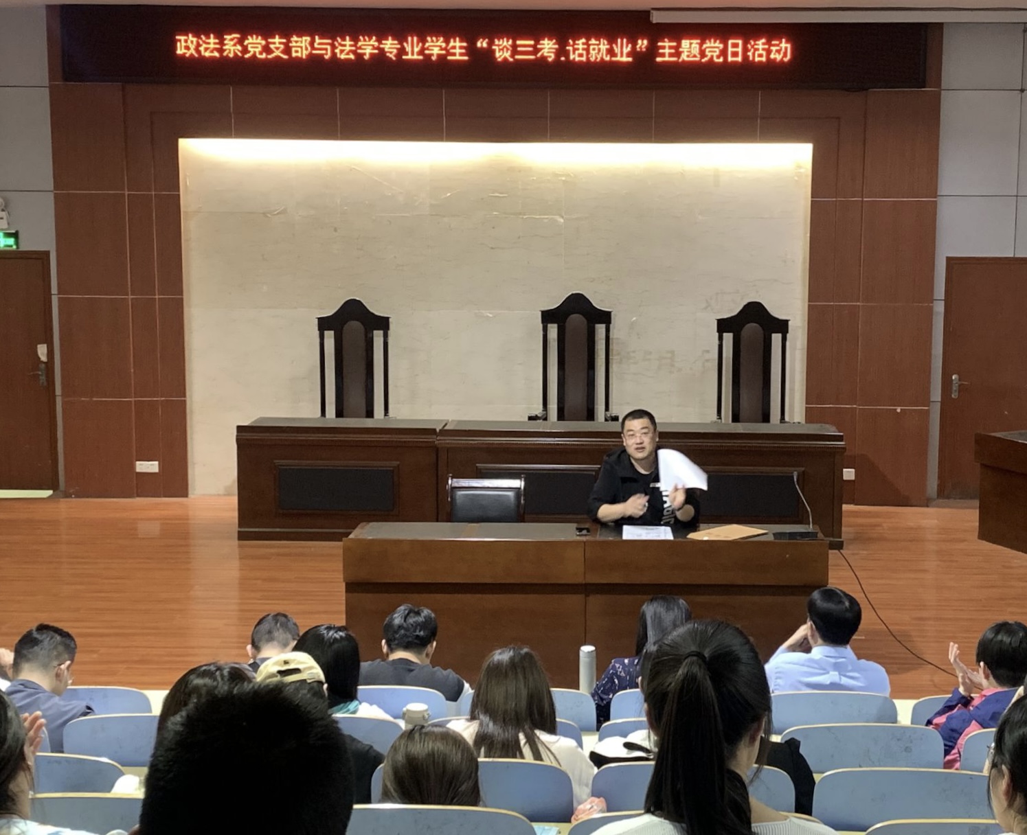 为帮助学生规划在校学习生活,理清学习思路,5月17日下午,3044永利集团官网在模拟法庭开展政法系党支部与法学专业学生“谈三考·话就业”主题党日活动,本次活动由政法系党支部书记、主任桑爱友主持,法学专业教师刘辉、李虎训担任主讲人,针对法学专业考研、法考、考公以及就业等相关问题给同学们进行了讲解,法学专业全体教师及2019级法学全体学生参加。