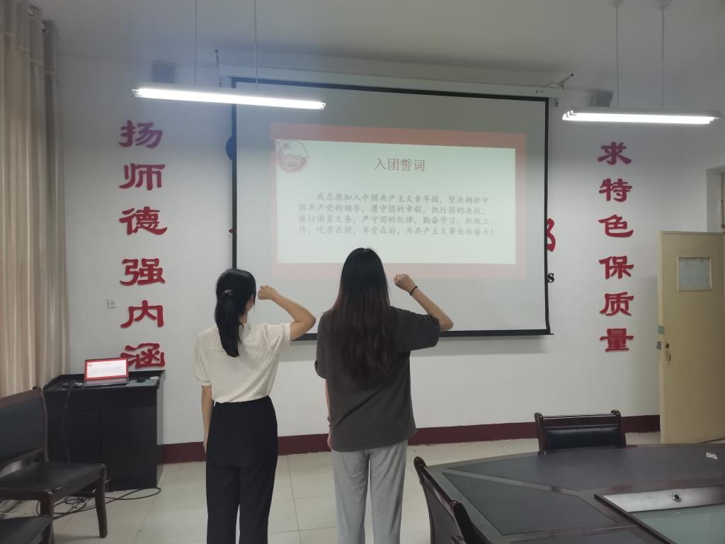 首先,郭鲁璇等两名团员面对入团誓词举起右拳庄重宣誓。她们用铿锵有力的声音向团组织表明加入中国共产主义青年团的自豪感和做一名合格团员的信心和决心,立志将牢记团的誓言,激发做一名共青团员的光荣感和责任感,增强为共产主义奋斗的信念。接着,她们学唱共青团团歌《光荣啊,中国共青团》,“我们是五月的花海,用青春拥抱时代;我们是初升的太阳,用生命点燃未来。”激情满怀、昂扬向上的旋律进一步引导她们坚定“永远跟党走”的信念。仪式结束后,新团员互相交流入团感想,她们表示:将更加刻苦学习,完善自己的不足,让自己配得上胸前闪耀的团徽,成为一名优秀的共青团员,做理想远大、信念坚定的模范,坚决践行“请党放心,强国有我”的青春誓言。