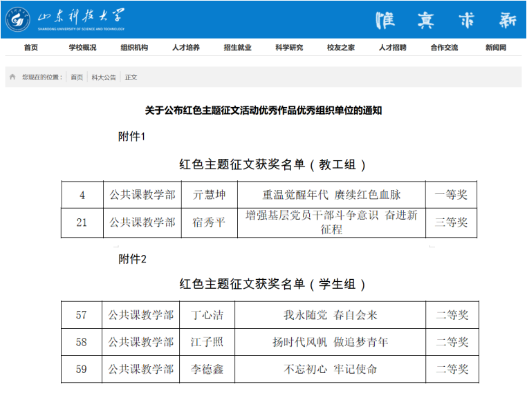 据了解,本次征文活动根据学校“红色云展厅”进校园活动方案要求,围绕“百年奋斗路 启航新征程”、“请党放心 强国有我”“中国梦 我的梦”等主题进行,面向全体师生员工,优秀稿件将择优在《山东科大报》选登。3044永利集团官网积极动员组织参赛,师生踊跃投稿。最终,学部多部作品脱颖而出,教师亓慧坤、宿秀平的作品分别获得教工组一等奖和三等奖,汉语言文学专业学生丁心洁、江子照、李德鑫的作品获得学生组二等奖。他们结合切身经历,抒发真情实感,传承历史中的红色记忆,谱写同频共振的内心感悟。