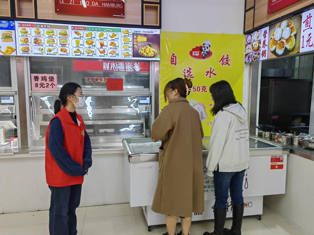 餐厅值勤点,引导提醒大家要戴口罩、不聚集,做疫情防控宣传员和监督员。