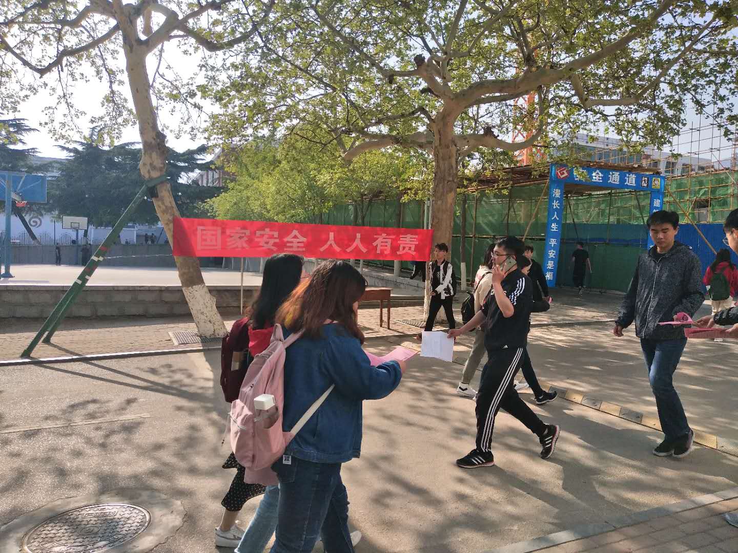 4月15日,校区团委、学生工作处、安全保卫部组织大学生志愿者,在校园内设立国家安全宣传咨询点,向广大师生发放全民国家安全教育日宣传材料近1000份,回答了学生提出的有关全民国家安全的一些常识问题。在校园内悬挂起全民国家安全标语条幅,营造了浓厚的全民国家安全教育日活动宣传氛围,将活动开展推向高潮。