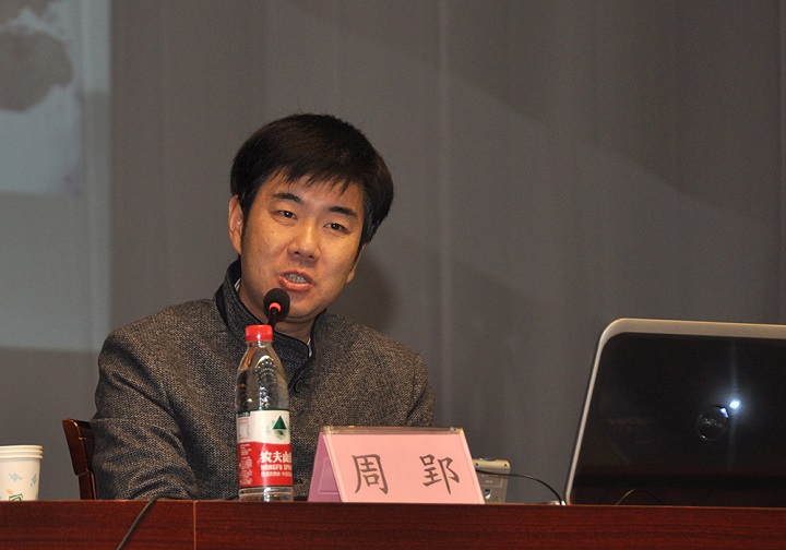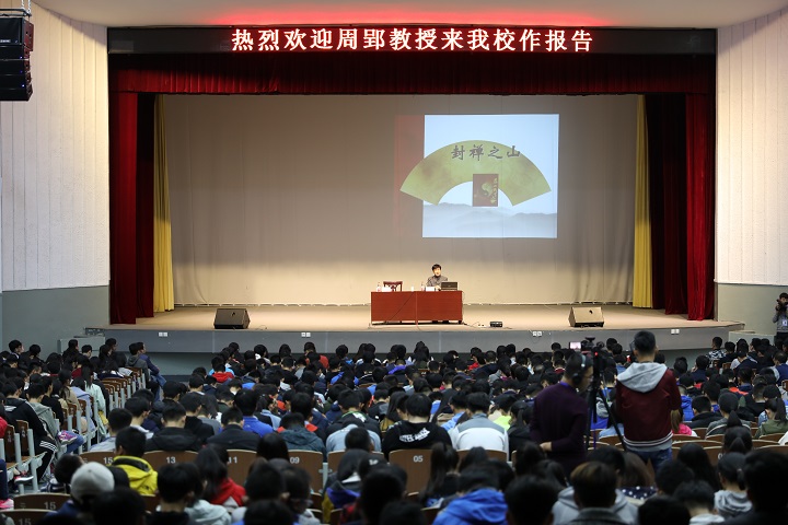 报告伊始,周郢将五岳独尊的东岳泰山比作一部厚重无朋的皇皇巨著,指出泰山在中华五千年的文明史上既是精彩纷呈的文化的长卷,又是波诡云谲的历史的大书。他以泰山之名从“大山”到“太山”再到“泰山”的历史沿革为切入点,以秦皇汉武等六位封建帝王的泰山封禅大典为经,再以上至高官巨贾下至黎民百姓对泰山的顶礼膜拜以及数千年来发生在泰山上下的逸闻趣事为纬,密切结合自己筚路蓝缕,抉幽探微,三十三年如一日研读泰山取得的累累硕果,旁征博引,娓娓道来,深入浅出地论证了泰山集“天下大山”、“封禅之山”、“帝王之山”和“女神之山”于一身的国山地位,全面深刻的诠释了“身凌绝顶的攀登意志,重于泰山的价值取向,不让土壤的博大胸襟,国泰民安的美好寄托和捧日擎天的精神追求”这一泰山精神的多重内涵。两个小时的报告,掌声不断。互动问答环节,师生听众异常踊跃,大家就“泰山石敢当的渊源”、“十八盘命名的考量”以及“东皇太一与东岳大帝的关系”等进行了提问,周郢逐一进行了阐释。
