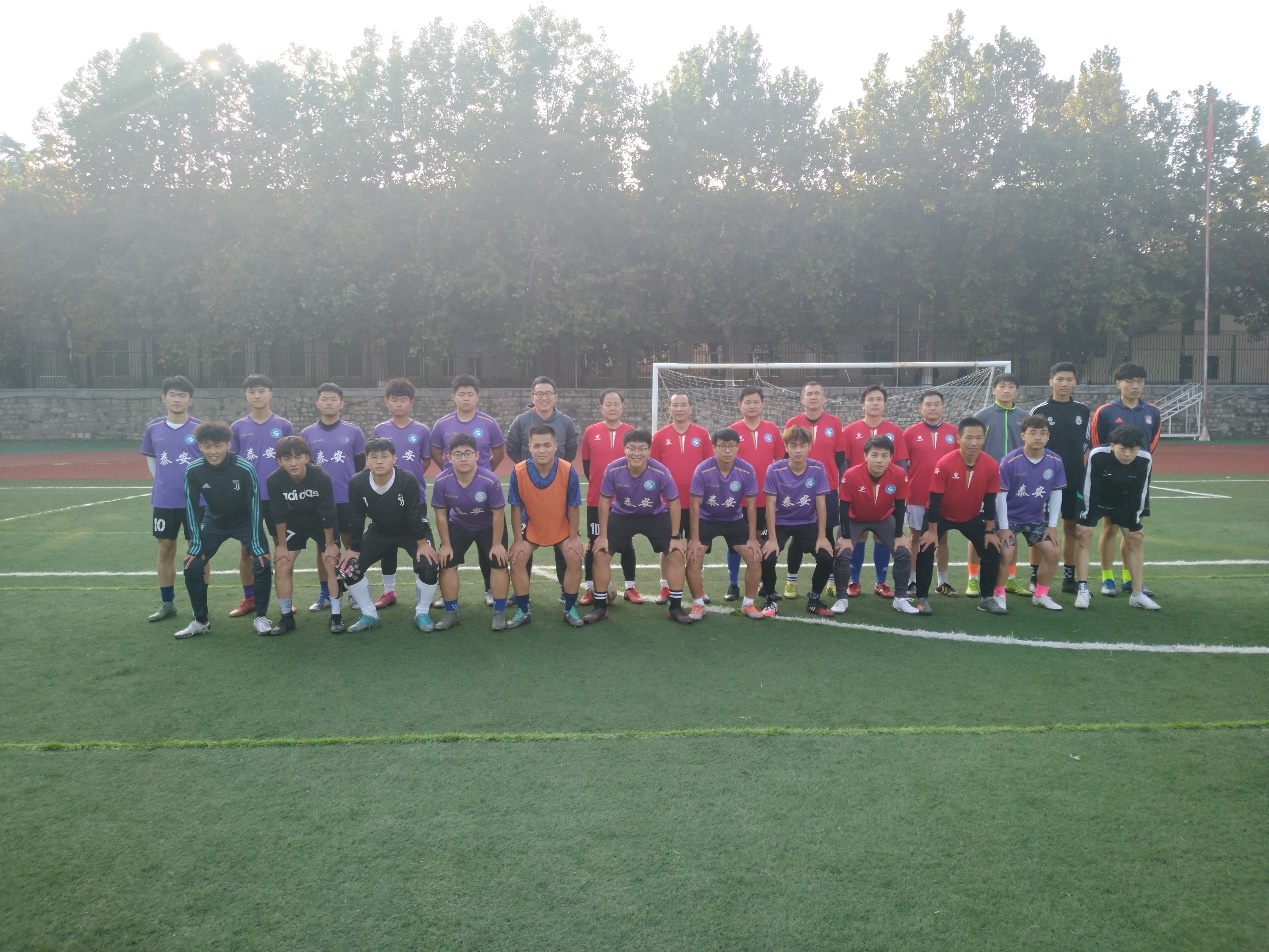 10月17日下午,泰安校区教职工足球协会的老师们利用周末时间组织部分学生代表举办了一场9人制师生足球友谊赛。经过90分钟的激烈争夺,比赛最终以8:8的大比分握手言和。