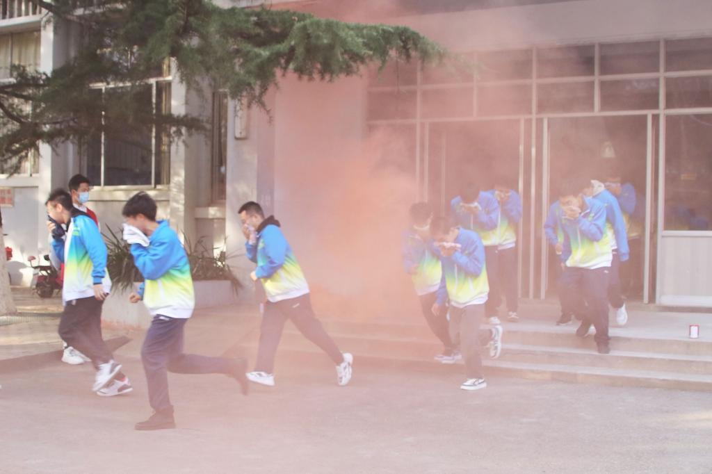 本次演练以3、4、6号学生公寓和1号教学楼为逃生演习点。演练开始,演练指挥组点燃各宿舍楼和教学楼下的着火点,并吹响警哨。听到警报,楼长、宿管人员和学生干部立即向各寝室学生发出警报通知,并组织疏散。在浓烟中,同学们用湿毛巾捂住口鼻快速、有序沿逃生路线疏散,安全到达疏散场地,各救援组迅速到达现场展开救援,从发出“火灾”信号到集合完毕全程用时不到4分钟。