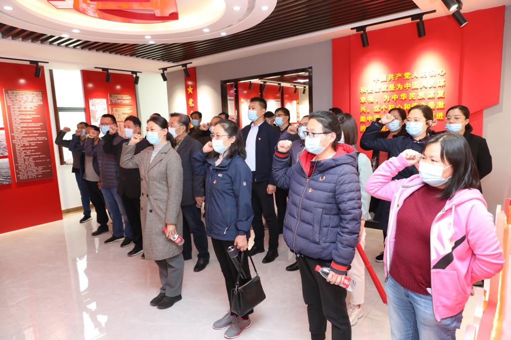 在入党誓词墙前,大家怀着无比崇敬的心情,举起右手,紧握拳头,在庄严肃穆的气氛中重温入党誓词。